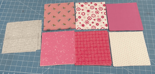 From each fabric quarter, cut 6 squares measuring 6.5 x 6.5 inches. You will need 42 squares.