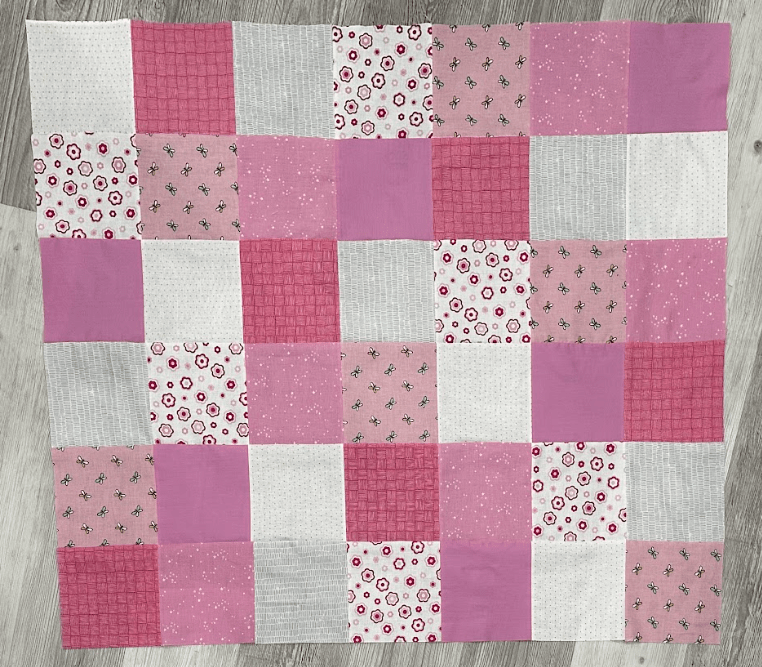 This baby quilt should measure 42×49 inches when you are finished. This pattern will require you to cut 6.5 inch squares from 7 fabric quarters and use a traditional piecing method to stitch them into rows, then stitch the rows together. Yardage is based on fabric that is at least 40” wide.