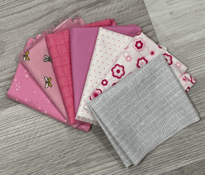Start by choosing 7 fabric quarters or 7 fat quarters that go well together. If you bought a kit from my shop, this step is already done for you!
