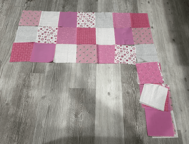 Once you are happy with the layout, begin sewing the squares together in rows. Be sure to sew them with the right sides together.